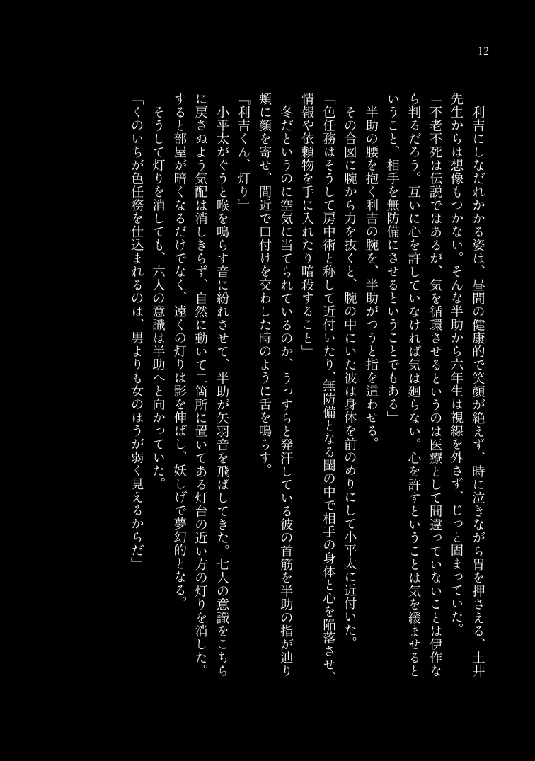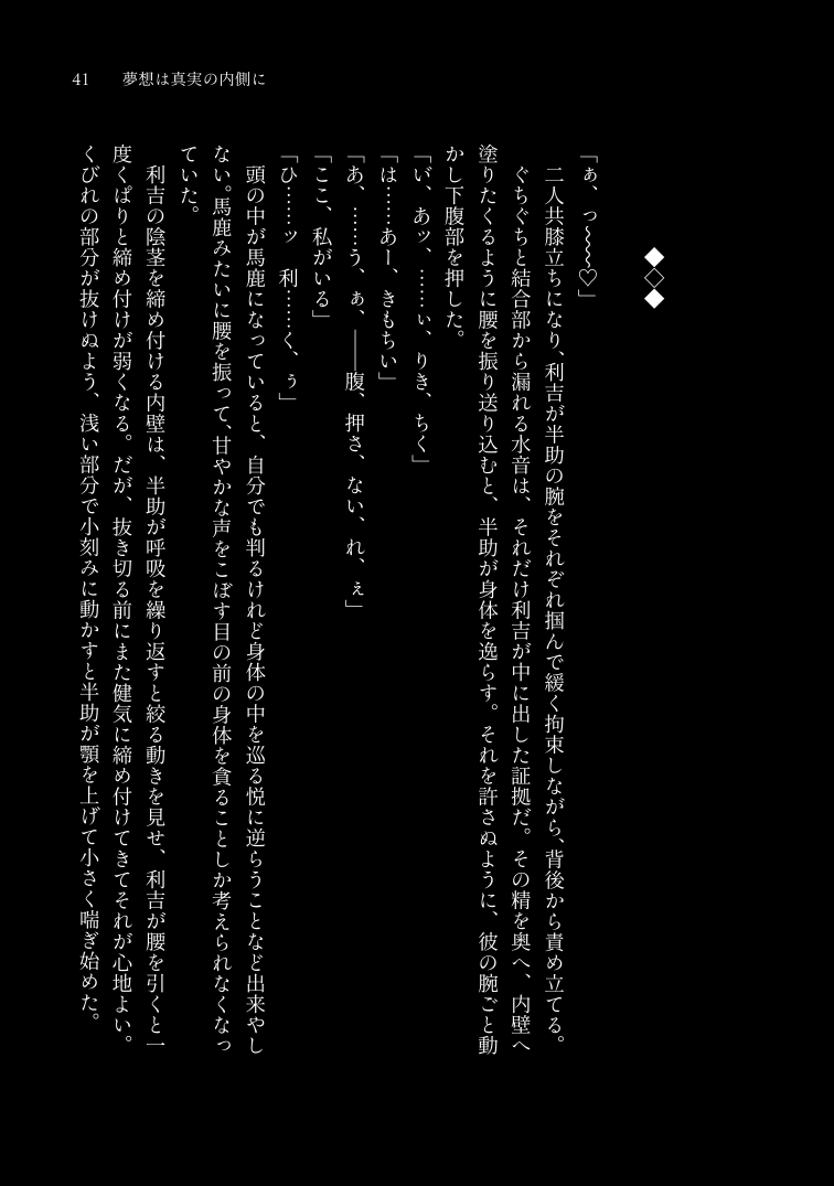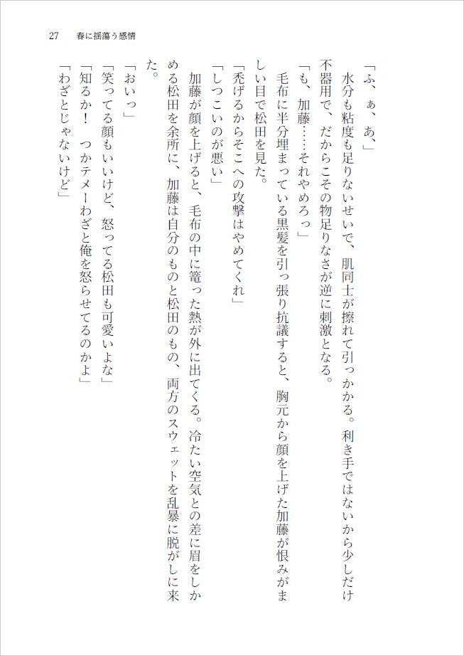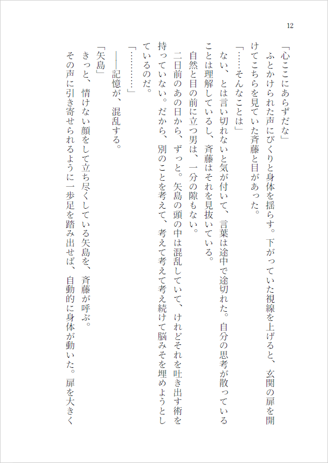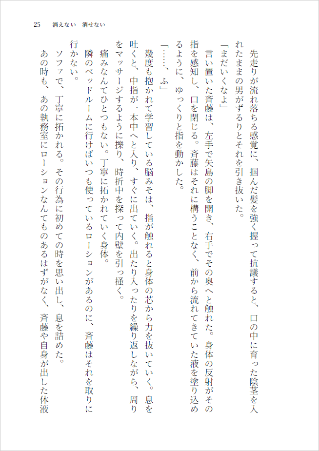 消えない 消せない 里つばめ作品 斉藤誉×矢島千紘 2023/05/04(木) SUPER COMIC CITY 30 -day2- A6|40P 成人向け|イベント価格:200円 現実と虚構と境界線の後日談、その後。ほまちが、触れ合っているだけの短いお話です。 組版01 02 サンプル 完売