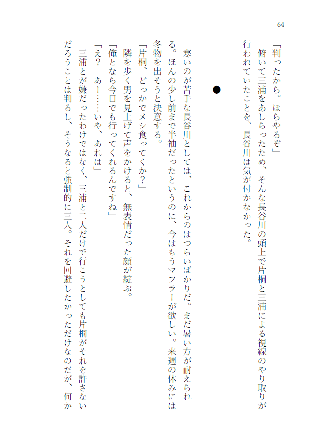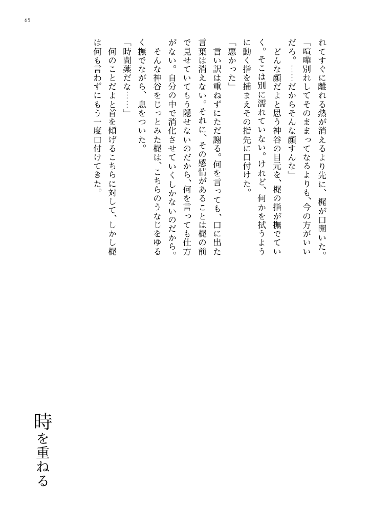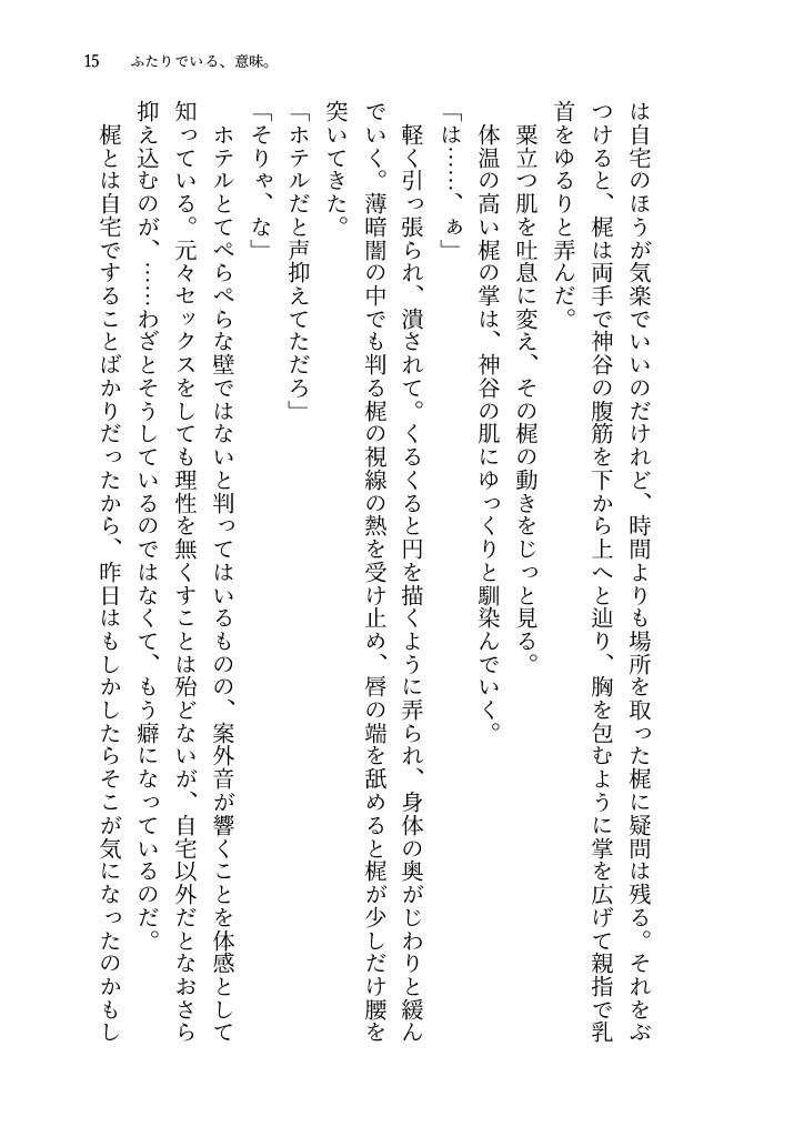 ふたりでいる、意味。 里つばめ作品 梶孝臣×神谷恵一 2024/03/17(日) HARU COMIC CITY 32 A6|58P 成人向け|イベント価格:300円 本編終了後、新潟から帰ってきた直後の二人。 素直になるということがわからない神谷と、そんな神谷を甘やかす梶の物語。 組版01 02 サンプル 通販